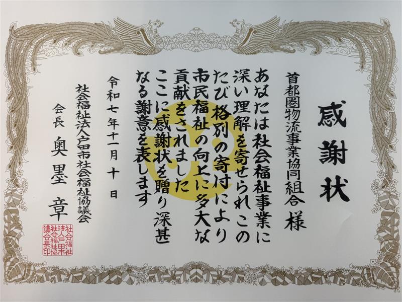 HOME > ブログ > 戸田市社会福祉協会様より感謝状を頂戴しました ブログ 2025.11.25 戸田市社会福祉協会様より感謝状を頂戴しました 弊組合では、事業所(戸田市 Logistics Team )に設置している自動販売機の売上の一部を戸田市の社会福祉協議会へ寄付しております。 この取り組みに対して、戸田市社会福祉協会様より感謝状を頂戴いたしました。 引き続き事業活動を通じて、私たちのできる社会貢献活動をし、地域社会発展につながるよう推進してまいります。
